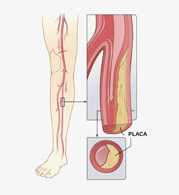 La enfermedad ateromatosa (ateroesclerosis) puede llevar a la obstrucción de las arterias de las piernas. Cuando esto ocurre aparece un síntoma característico llamado claudicación intermitente. Consiste en la aparición de dolor en las pantorrillas al caminar una distancia dada, cede al detenerse y reaparece al volver a caminar. Y si las arterias obstruidas están localizadas en el abdomen (arterias iliacas), el dolor puede comprometer los muslos y glúteos. En el hombre la disminución de irrigación a nivel de la pelvis puede llevar al desarrollo de impotencia sexual.