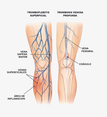 La trombosis venosa profunda es la formación de coágulos en las venas profundas (entre los músculos) de las piernas. Esta es una condición peligrosa ya que estos coágulos pueden movilizarse hacia el pulmón y llegar a provocar la muerte. Estos coágulos no van al cerebro u otros órganos ya que el pulmón filtra la sangre. Ocurre habitualmente luego de un periodo de reposo, ya sea por el uso de un yeso, una operación, un viaje largo u otra situación similar. Ocasionalmente ocurre sin haber mediado una causa aparente y, en estos casos, el uso de hormonas en la mujer, condiciones congénitas que favorecen la coagulación anormal de la sangre y ocasionalmente tumores, son causas que deben estudiarse.